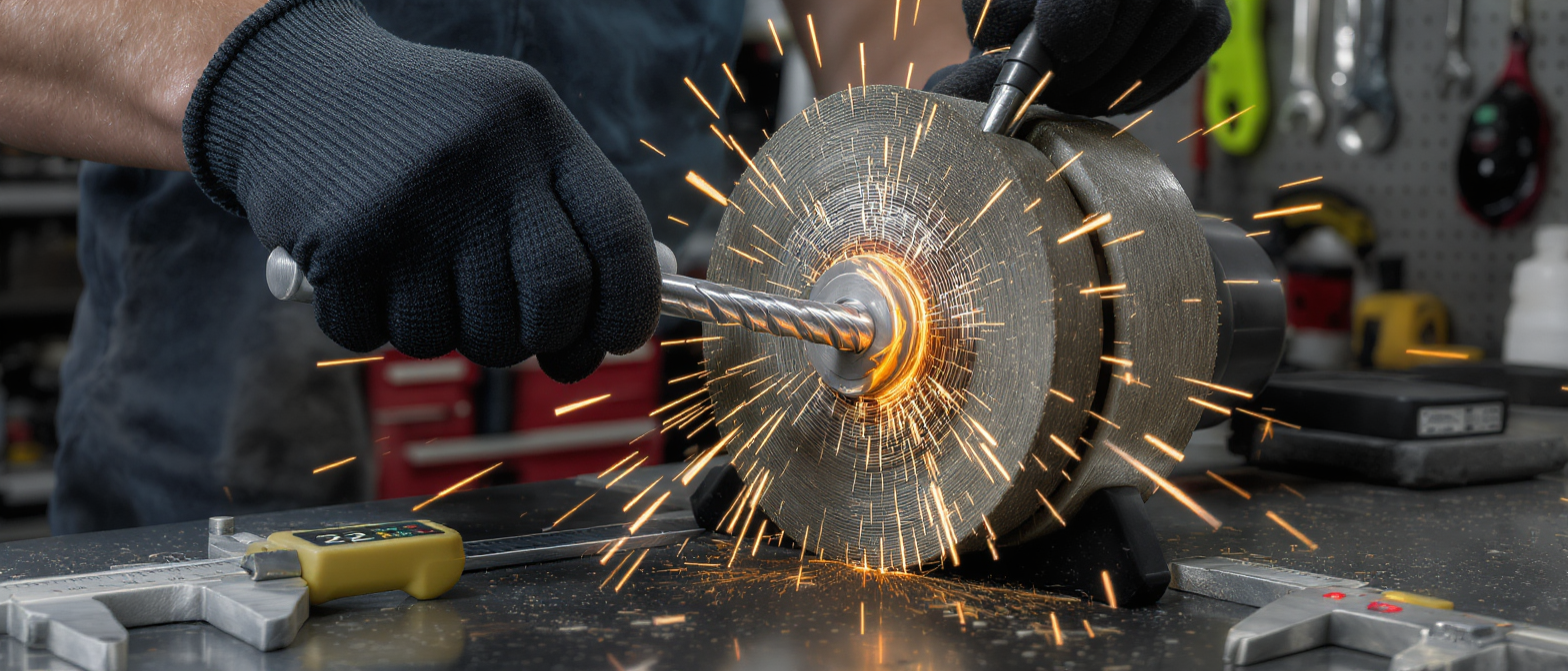 Points de vigilance : lors du contact initial, le tranchant touche d’abord la meule ; le corps du foret doit ensuite suivre en douceur pour dérouler la surface de coupe. Observer la couleur des étincelles et la teinte du métal permet de détecter un échauffement excessif ; si la pointe devient bleue, il faudra refroidir immédiatement pour éviter le recuit et la perte d’une dureté critique.