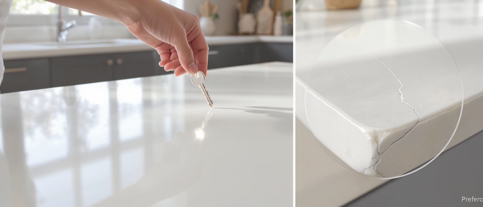 Du point de vue réparabilité, la réparation céramique d’un éclat d’angle implique généralement un rebouchage à base de résine époxy teintée et un ponçage/polissage local. Cette opération est technique : la jonction entre matériau neuf et ancien doit être invisible et mécaniquement résistante. Si la fissure traverse la dalle, l’intervention devient palliative et le remplacement de la dalle est souvent la solution la plus pérenne.